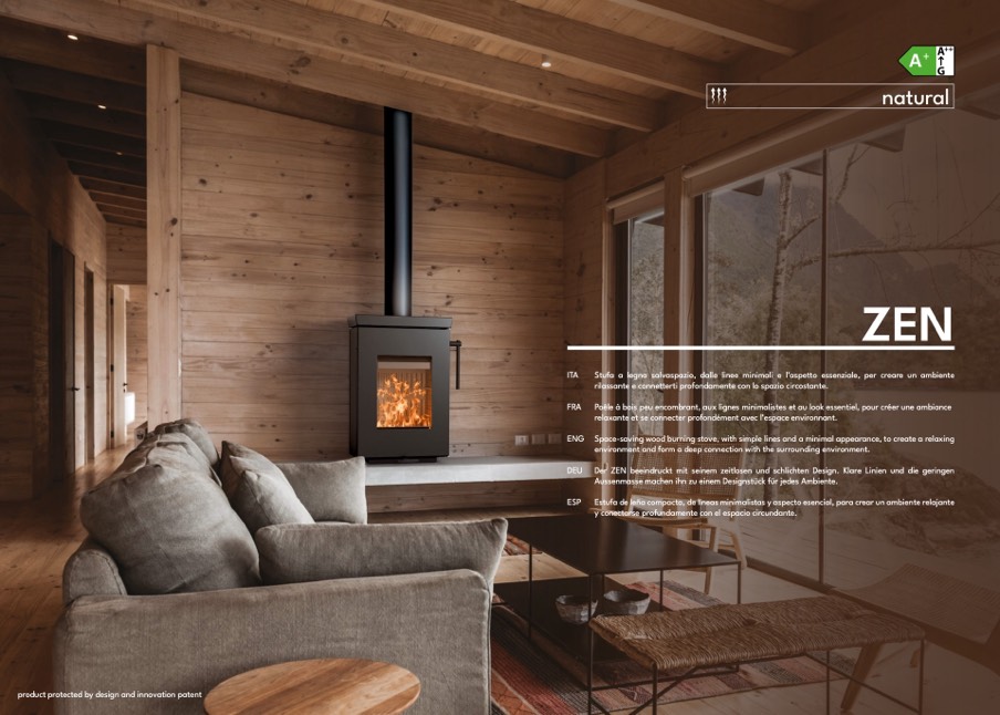 ENG Space-saving wood burning stove, with simple lines and a minimal appearance, to create a relaxing