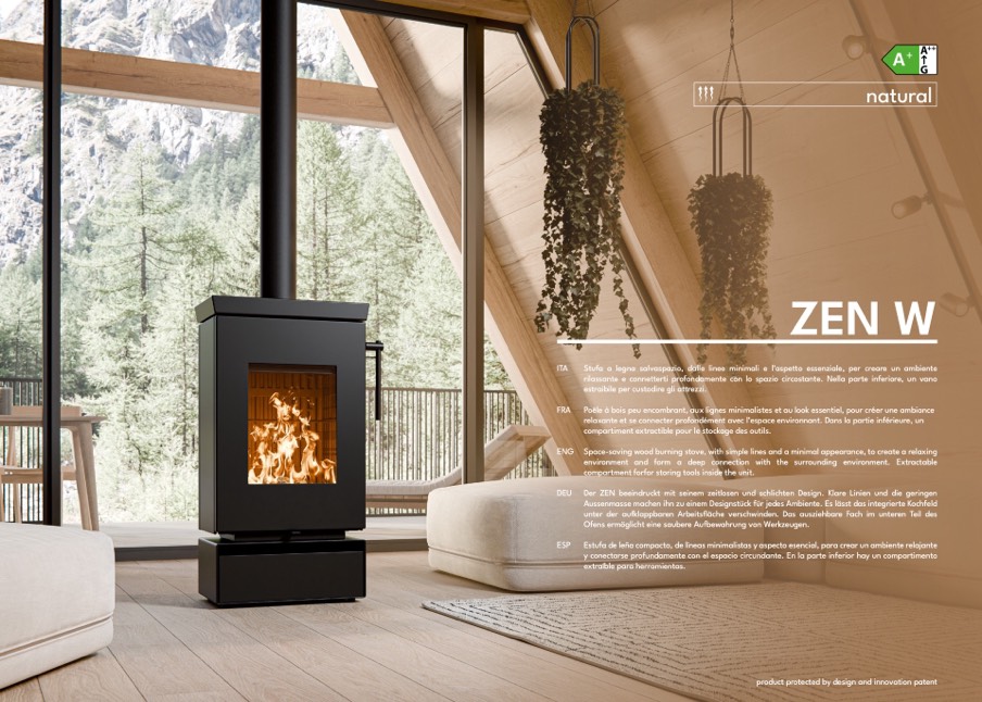 ENG Space-saving wood burning stove, with simple lines and a minimal appearance, to create a relaxing