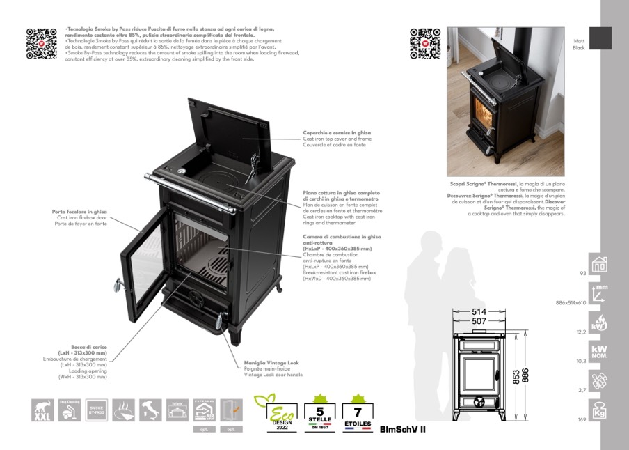 •Tecnologia Smoke by Pass riduce l’uscita di fumo nella stanza ad ogni carica di legna,