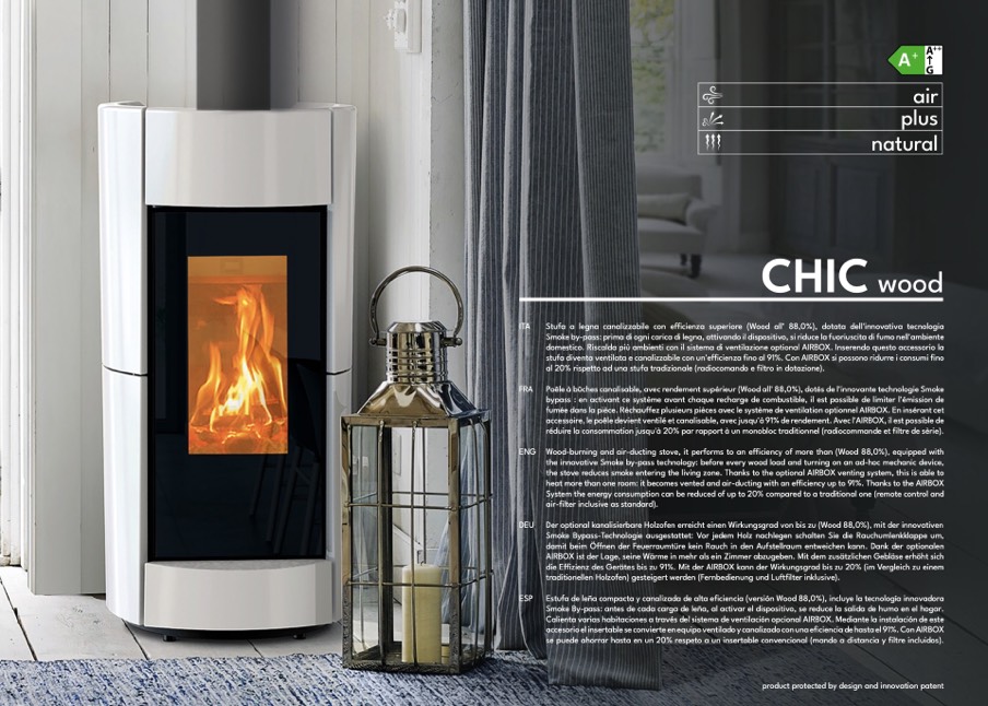 the innovative Smoke by-pass technology: before every wood load and turning on an ad-hoc mechanic device,