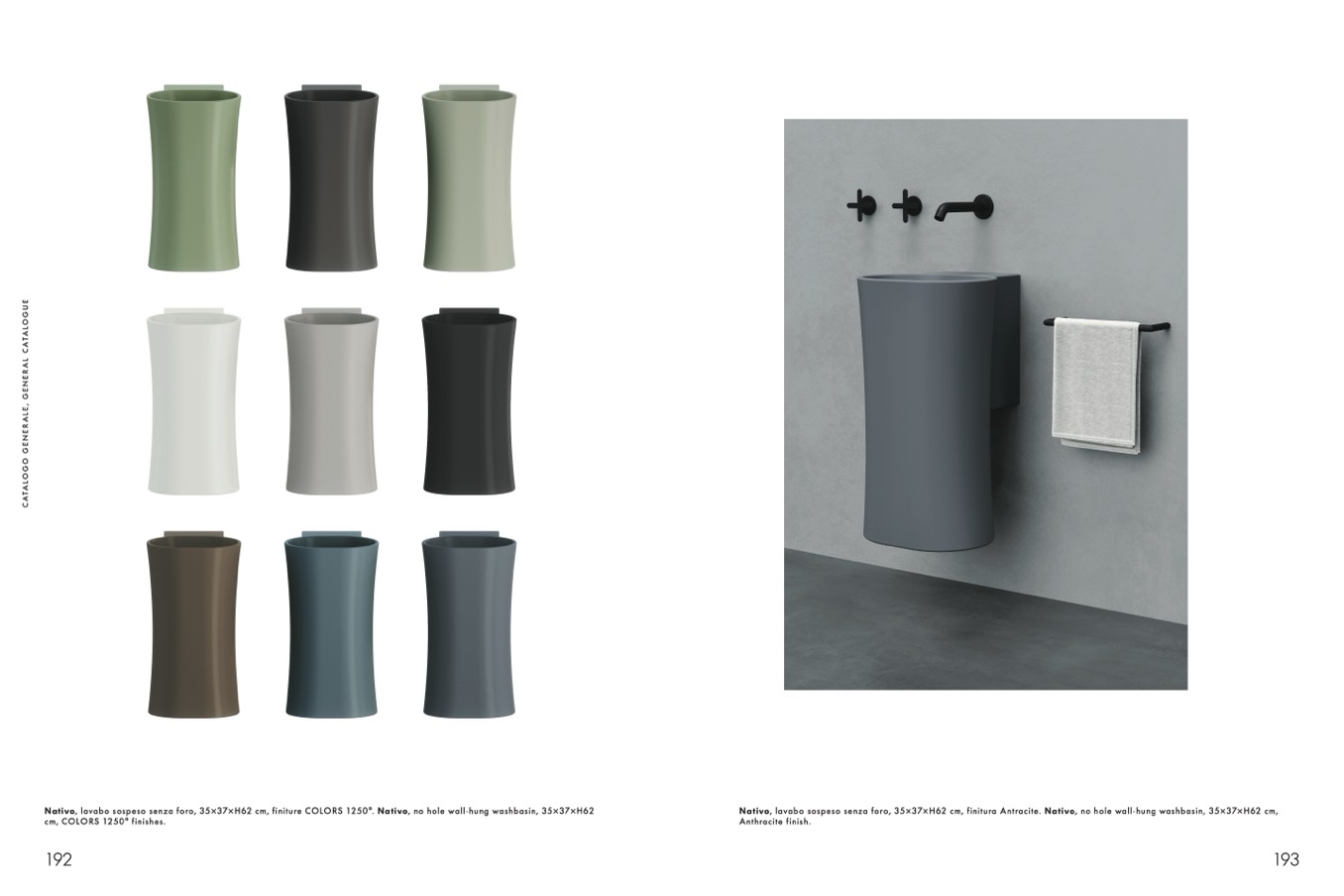 Nativo, lavabo sospeso senza foro, 35×37×H62 cm, finiture COLORS 1250°. Nativo, no hole wall-hung washbasin, 35×37×H62