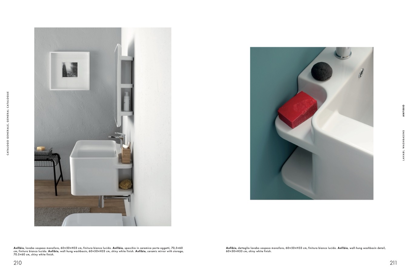 cm, finitura bianco lucido. Anfibio, wall-hung washbasin, 60×50×H33 cm, shiny white finish. Anfibio, ceramic mirror with storage,
