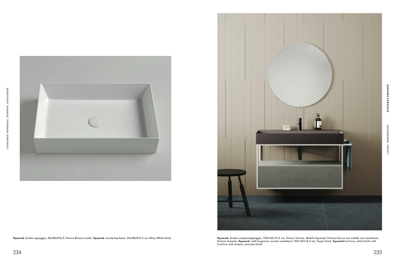 Squared, lavabo sospeso/appoggio, 102×45×12,5 cm, finitura Tortora. Mobile Squared, finitura bianco con mobile con cassettone,