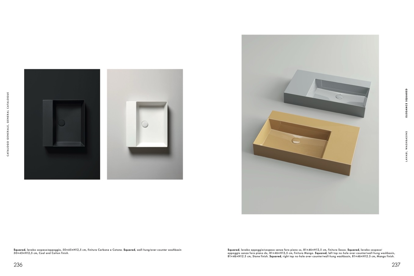 Squared, lavabo sospeso/appoggio, 50×45×H12,5 cm, finitura Carbone e Cotone. Squared, wall-hung/over-counter washbasin