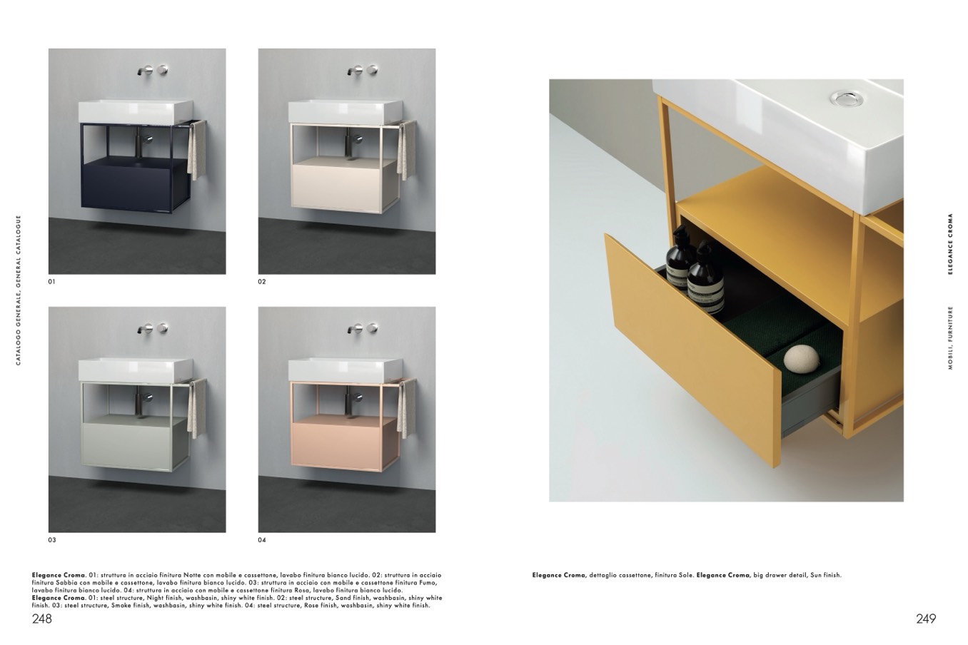 Elegance Croma. 01: steel structure, Night finish, washbasin, shiny white finish. 02: steel structure, Sand finish, washbasin, shiny white