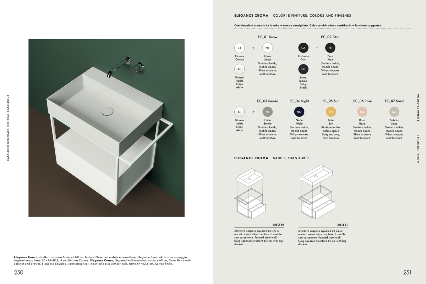 Elegance Croma, struttura sospesa Squared 60 cm, finitura Neve con mobile e cassettone. Elegance Squared, lavabo appoggio