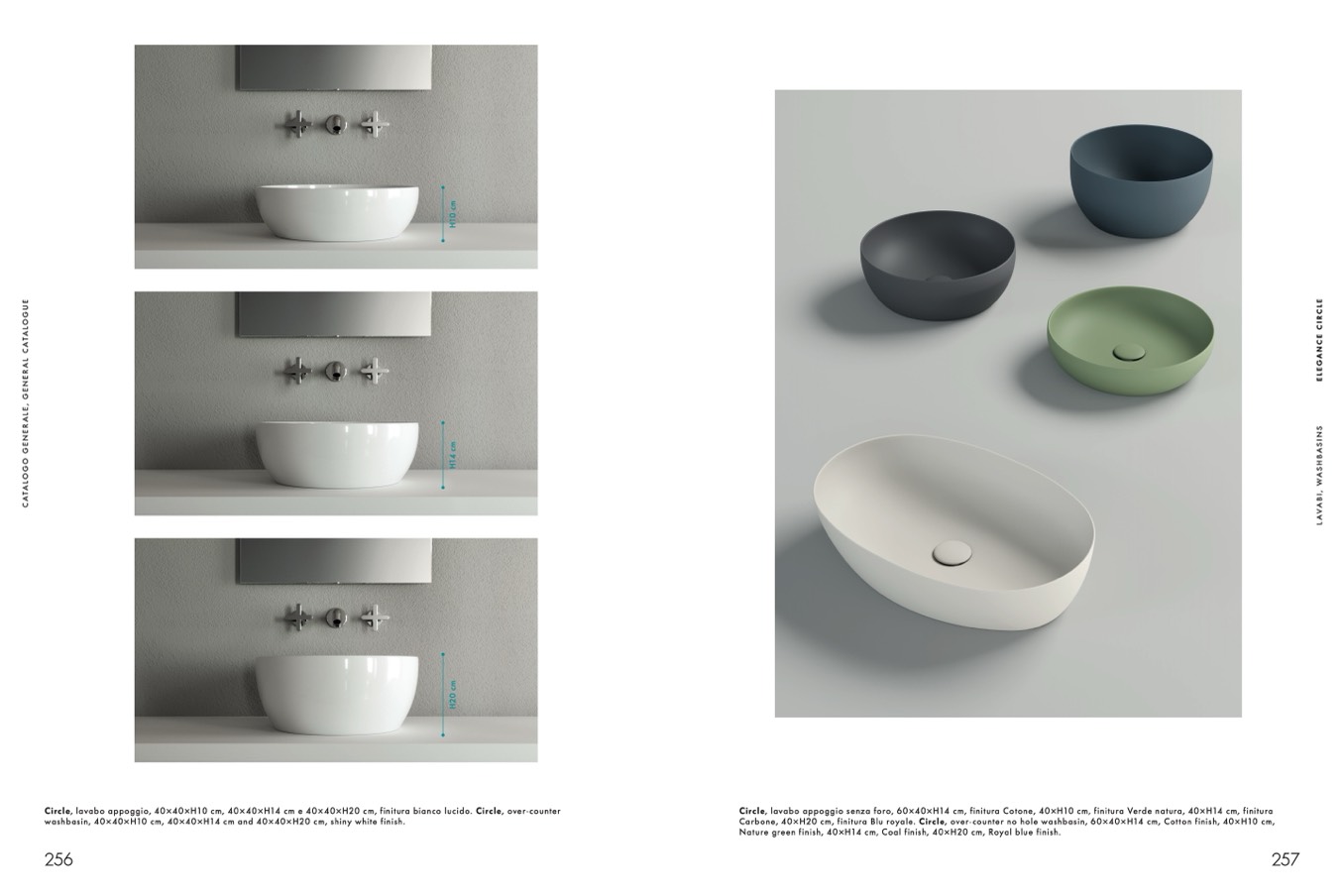 Carbone, 40×H20 cm, finitura Blu royale. Circle, over-counter no hole washbasin, 60×40×H14 cm, Cotton finish, 40×H10 cm,