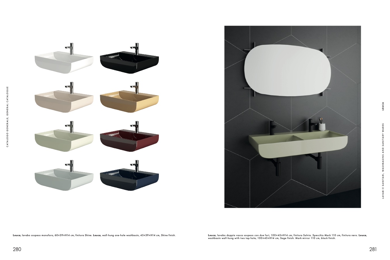 Leuca, lavabo sospeso monoforo, 60×39×H14 cm, finitura Shine. Leuca, wall-hung one-hole washbasin, 45×39×H14 cm, Shine finish.