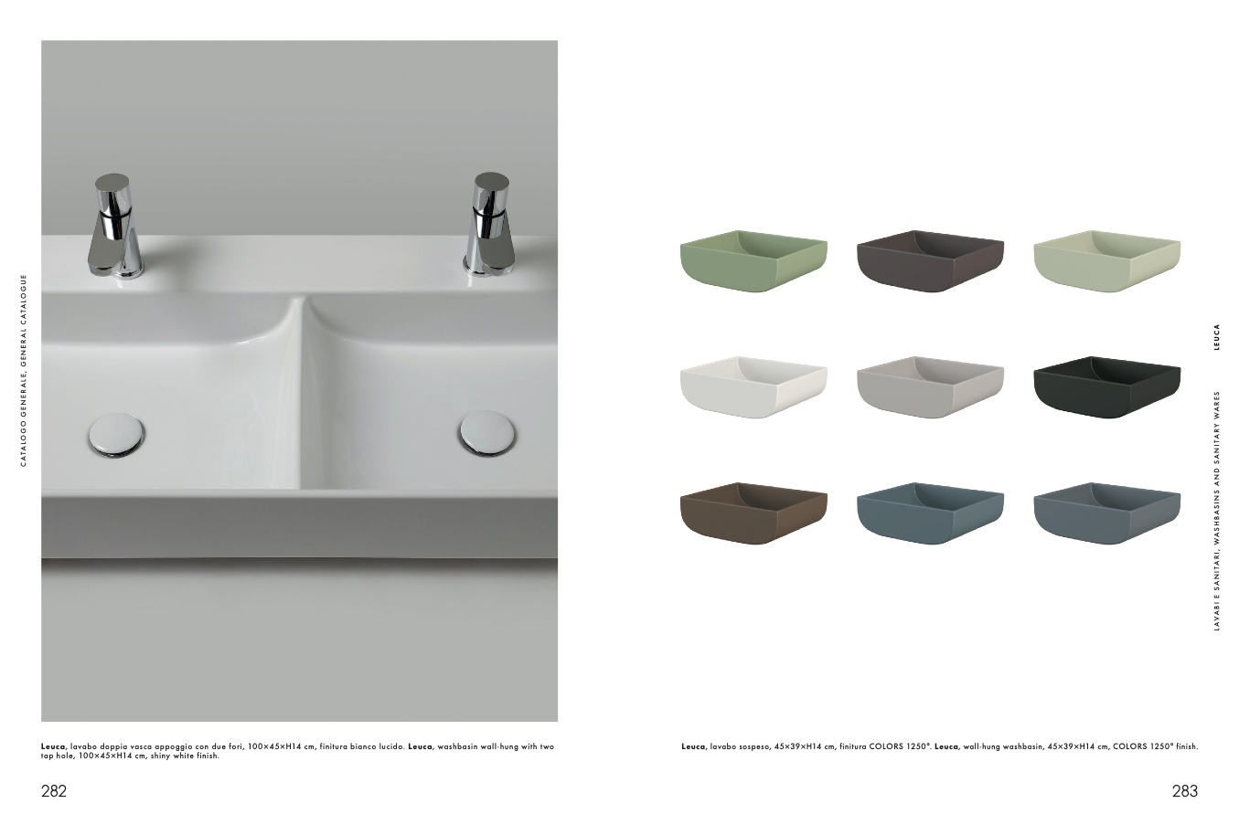 Leuca, lavabo doppia vasca appoggio con due fori, 100×45×H14 cm, finitura bianco lucido. Leuca, washbasin wall-hung with two