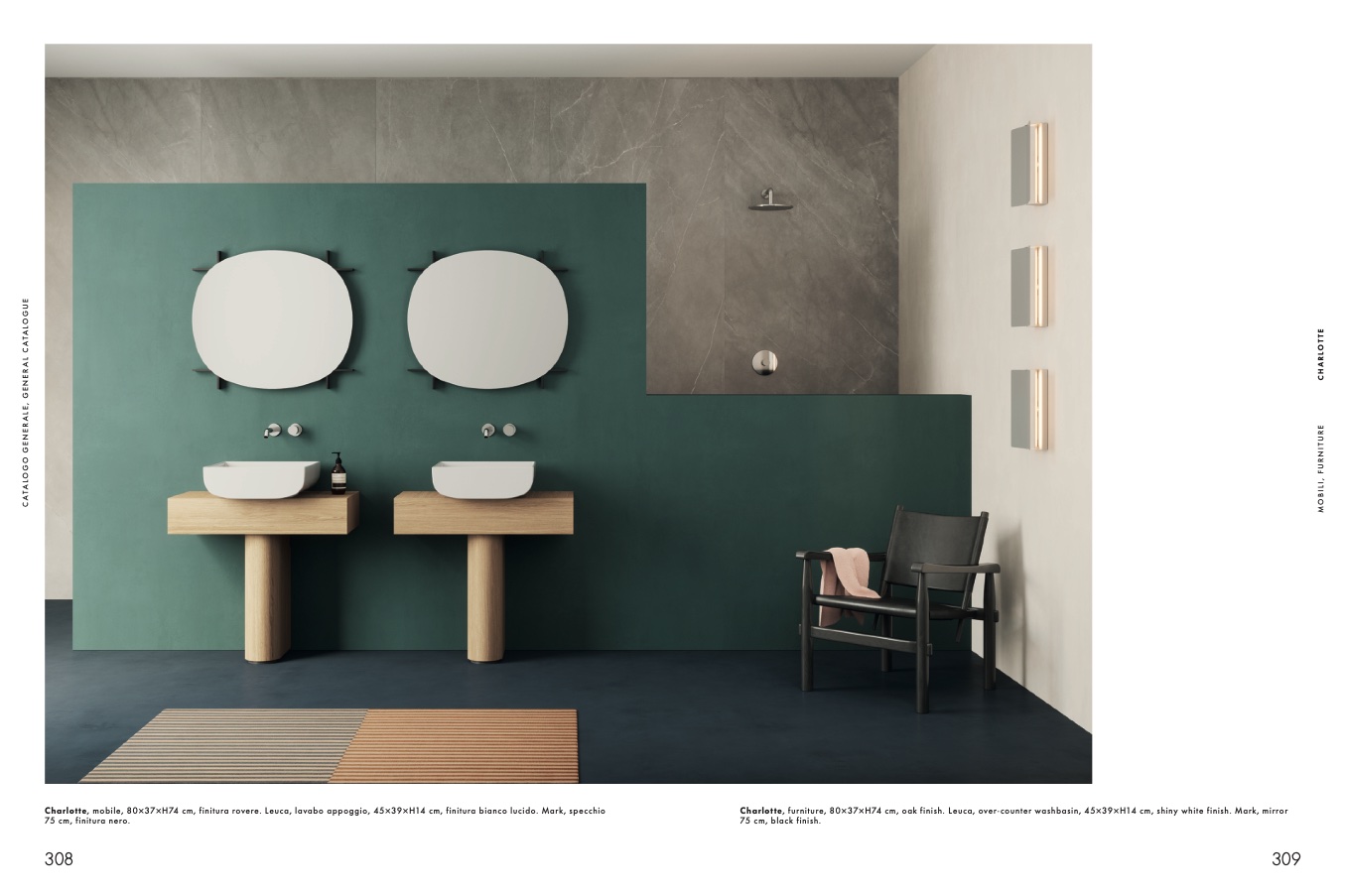 Charlotte, furniture, 80×37×H74 cm, oak finish. Leuca, over-counter washbasin, 45×39×H14 cm, shiny white finish. Mark, mirror