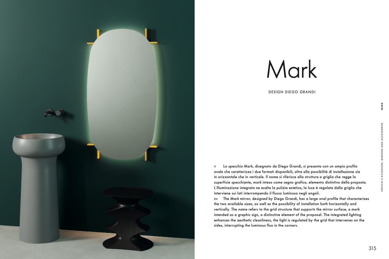 The Mark mirror, designed by Diego Grandi, has a large oval profile that characterizes