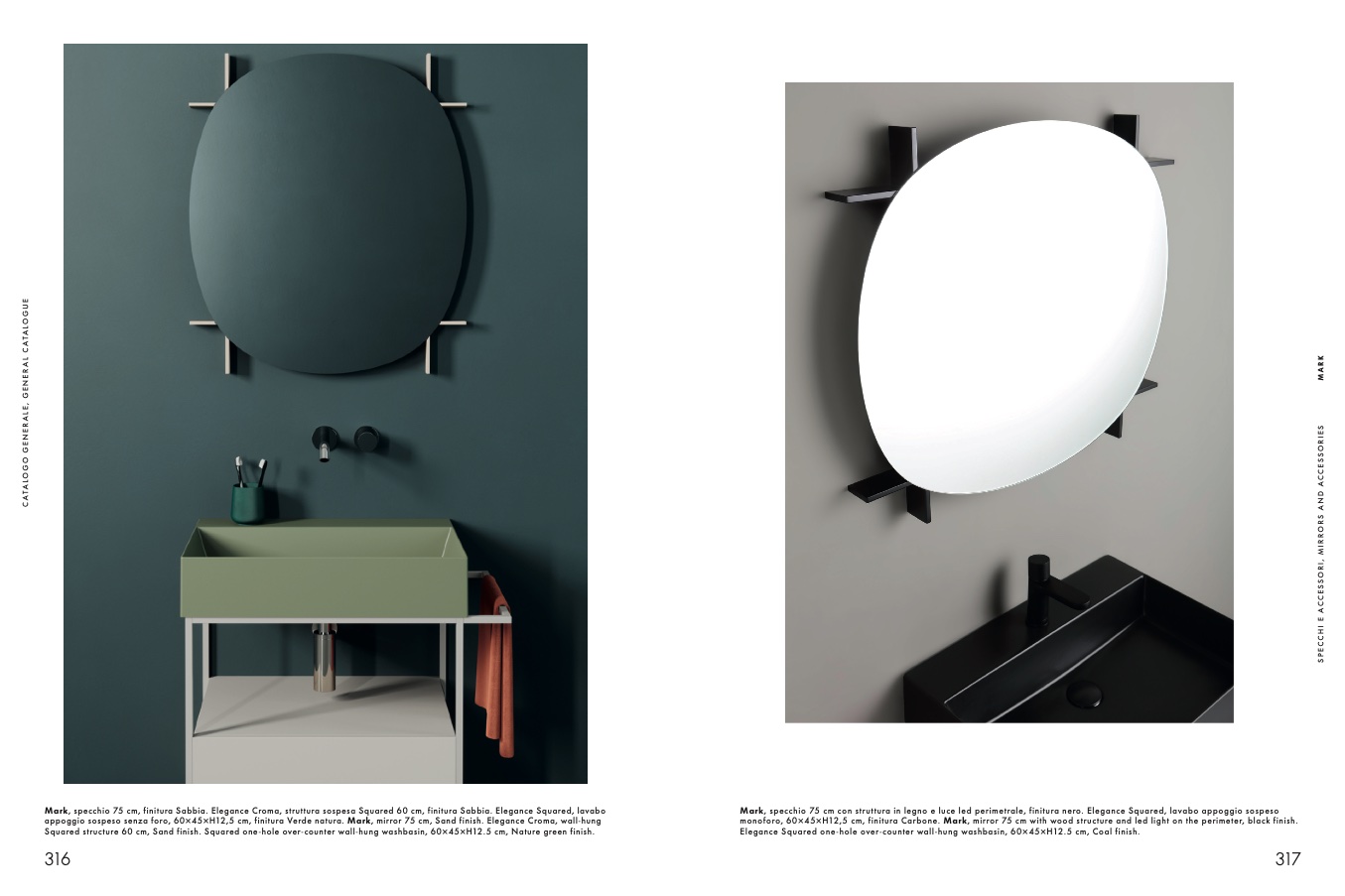 appoggio sospeso senza foro, 60×45×H12,5 cm, finitura Verde natura. Mark, mirror 75 cm, Sand finish. Elegance Croma, wall-hung