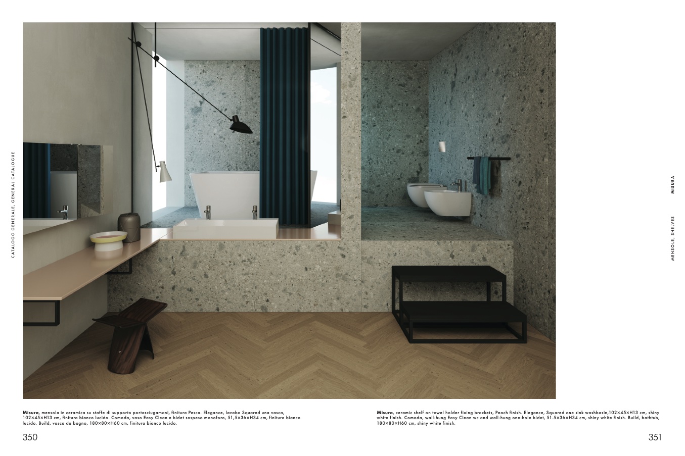 Misura, ceramic shelf on towel holder fixing brackets, Peach finish. Elegance, Squared one sink washbasin,102×45×H13 cm, shiny