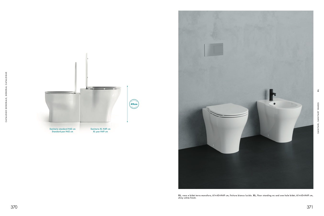 XL, vaso e bidet terra monoforo, 61×43×H49 cm, finitura bianco lucido. XL, floor standing wc and one-hole bidet, 61×43×H49 cm,