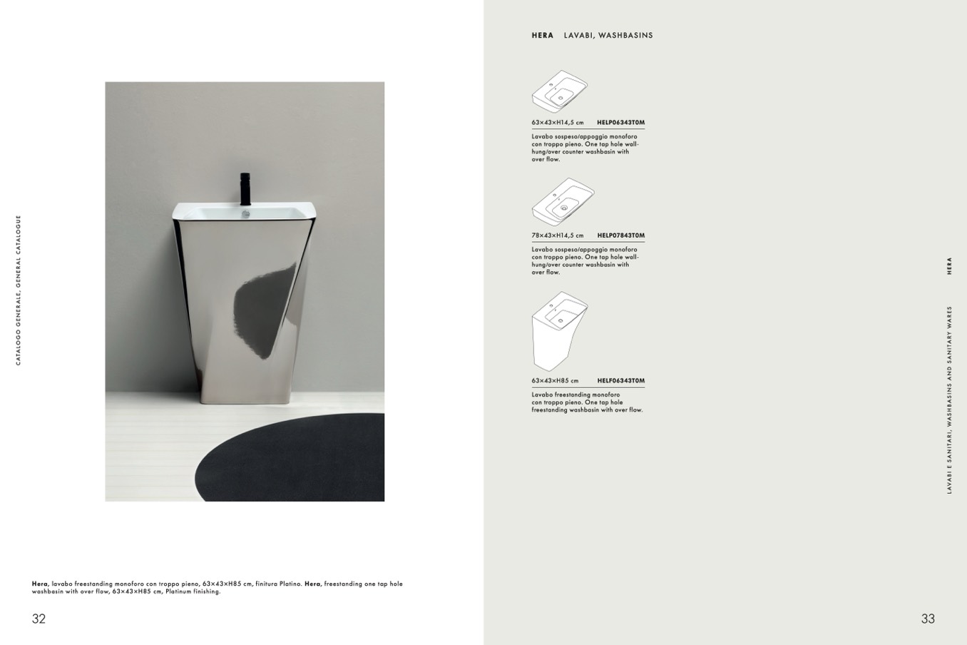 Hera, lavabo freestanding monoforo con troppo pieno, 63×43×H85 cm, finitura Platino. Hera, freestanding one tap hole