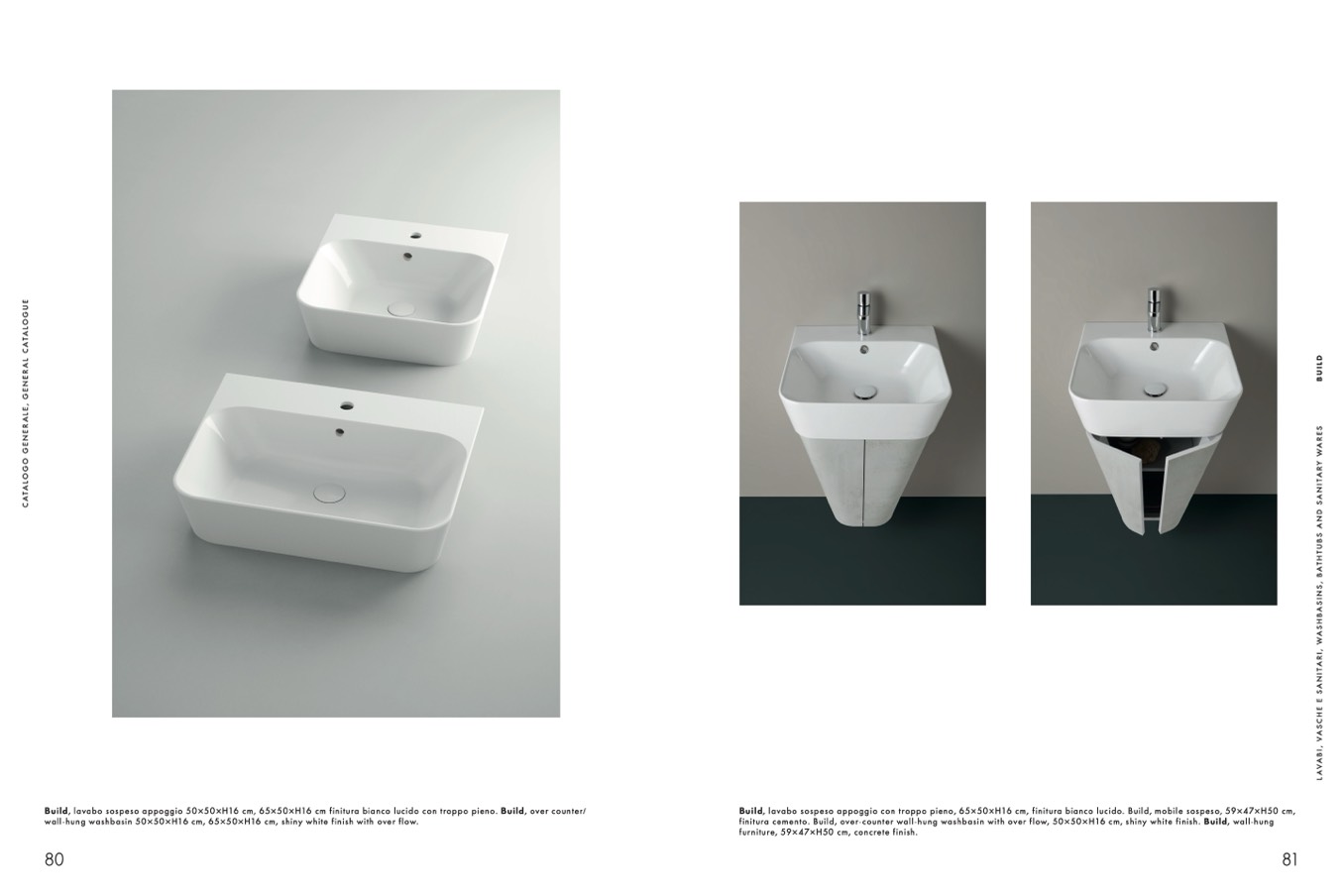 Build, lavabo sospeso appoggio 50×50×H16 cm, 65×50×H16 cm finitura bianco lucido con troppo pieno. Build, over counter/