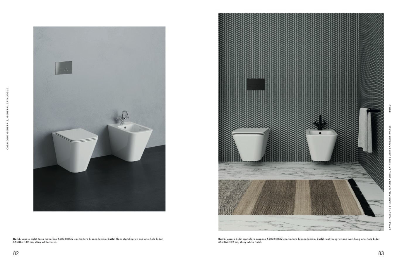 Build, vaso e bidet terra monoforo 55×36×H42 cm, finitura bianco lucido. Build, floor standing wc and one-hole bidet