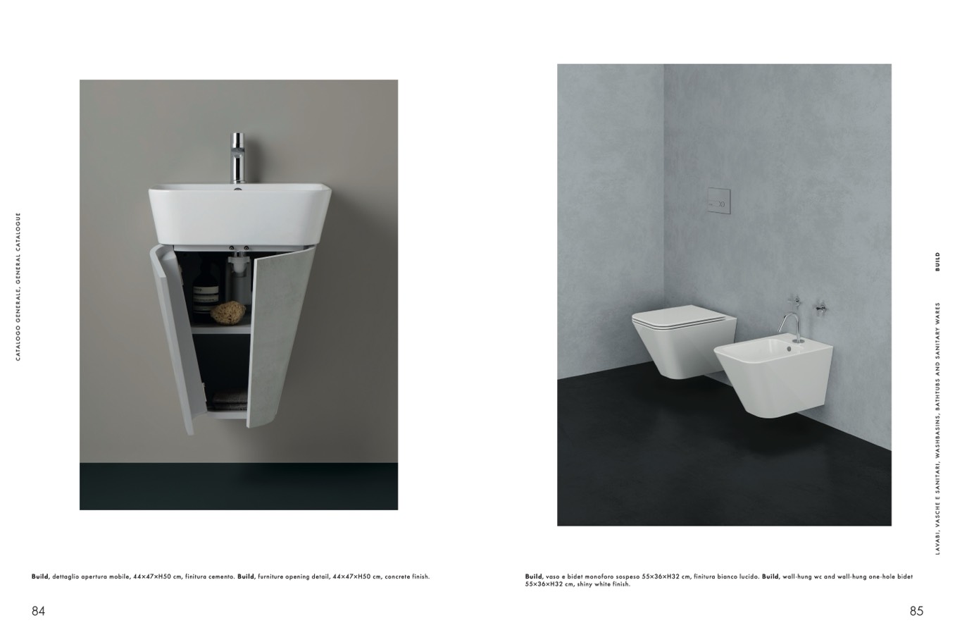 Build, vaso e bidet monoforo sospeso 55×36×H32 cm, finitura bianco lucido. Build, wall-hung wc and wall-hung one-hole bidet