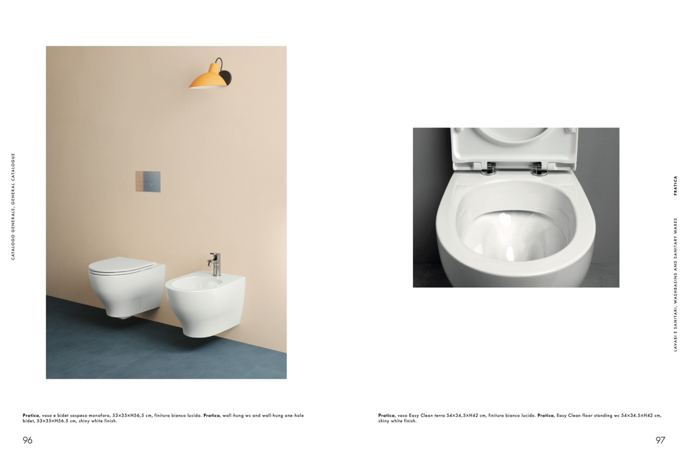 Pratica, vaso e bidet sospeso monoforo, 53×35×H56,5 cm, finitura bianco lucido. Pratica, wall-hung wc and wall-hung one-hole