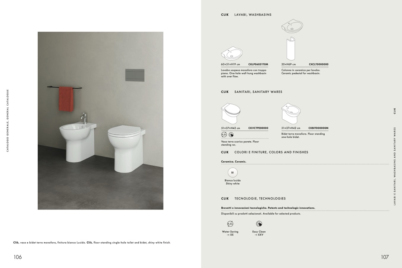 Clik, vaso e bidet terra monoforo, finitura bianco Lucido. Clik, floor-standing single-hole toilet and bidet, shiny white finish.