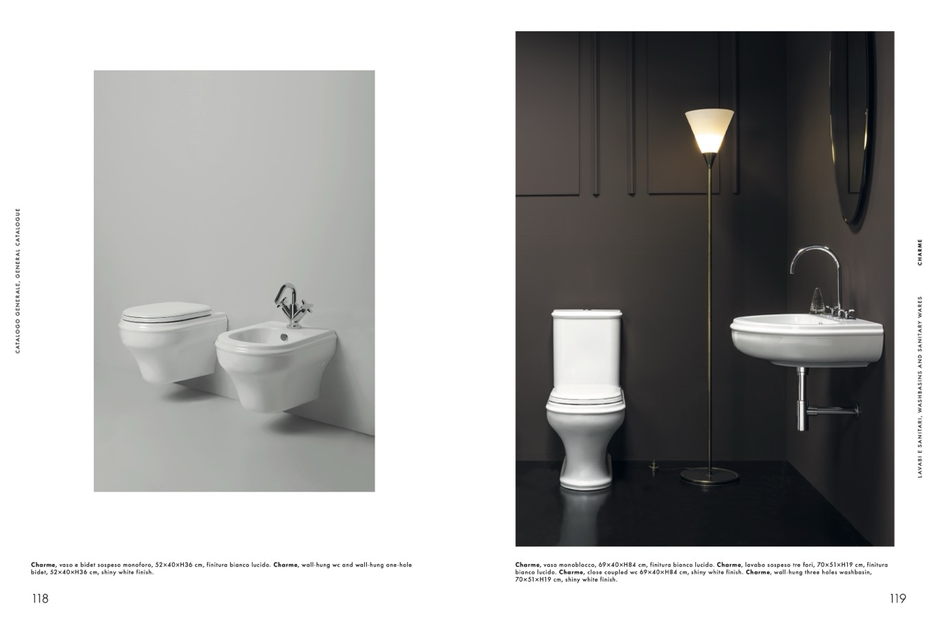 bianco lucido. Charme, close coupled wc 69×40×H84 cm, shiny white finish. Charme, wall-hung three holes washbasin,