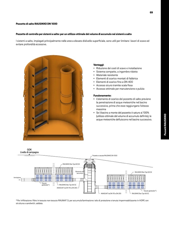 * Per infiltrazione: filtro in tessuto non tessuto RAUMAT 3; per accumulo/laminazione: telo di protezione e tenuta impermeabilizzante in HDPE con