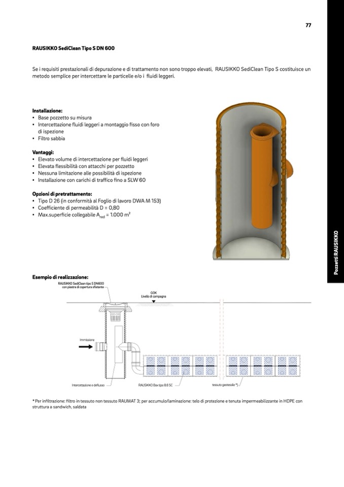 * Per infiltrazione: filtro in tessuto non tessuto RAUMAT 3; per accumulo/laminazione: telo di protezione e tenuta impermeabilizzante in HDPE con
