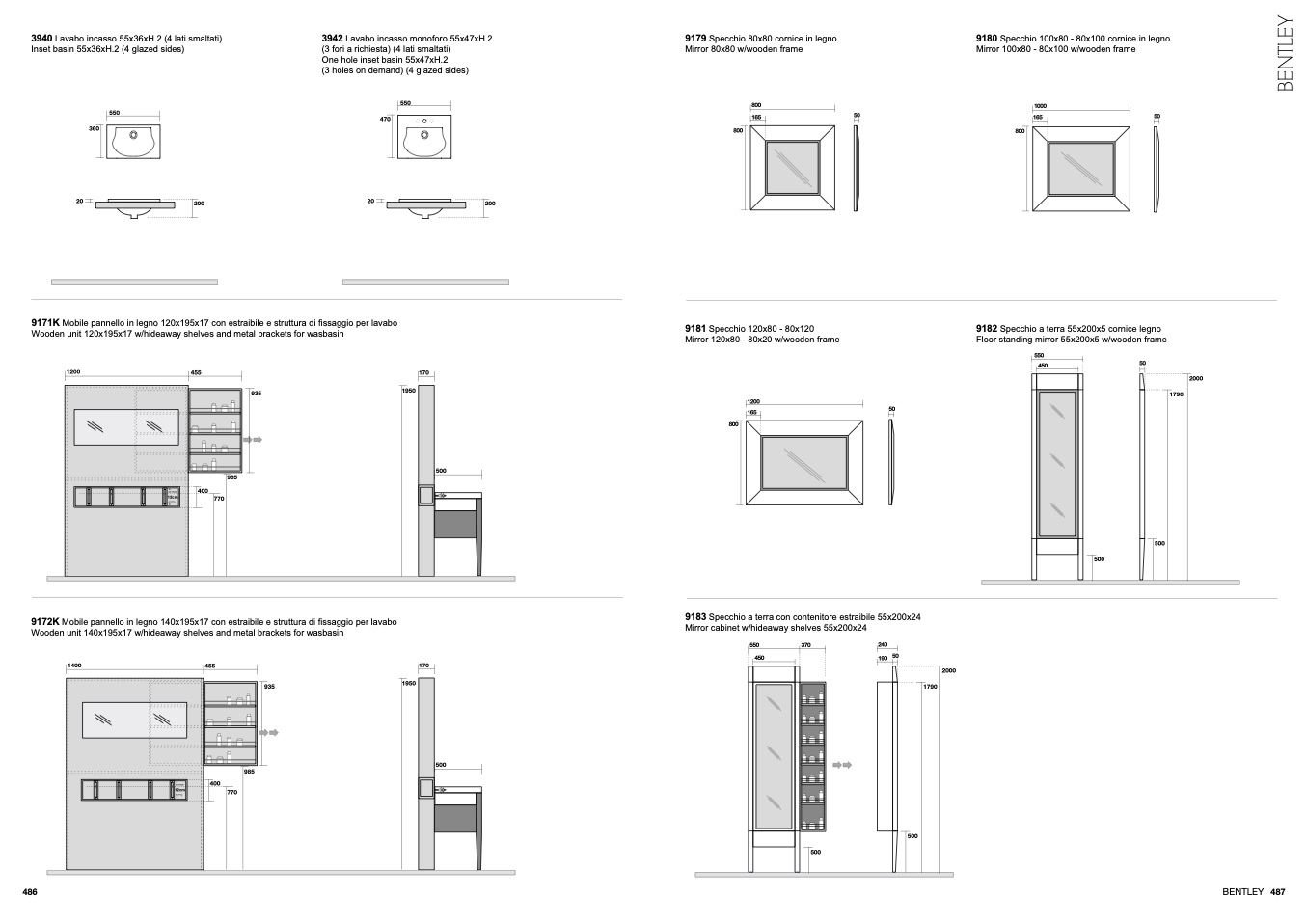 Mirror cabinet w/hideaway shelves 55x200x24