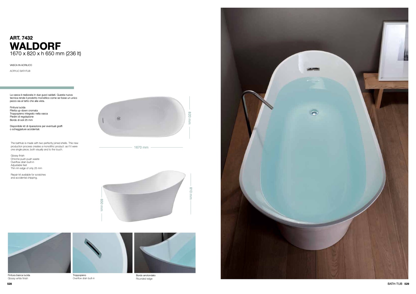 The bathtub is made with two perfectly joined shells. This new