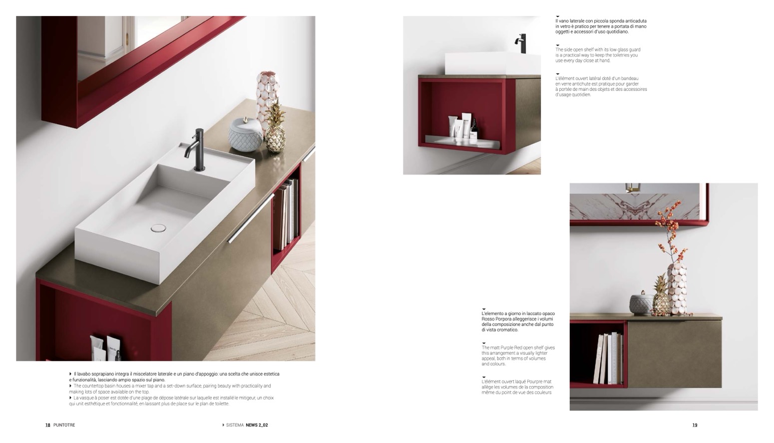 Il lavabo soprapiano integra il miscelatore laterale e un piano d’appoggio: una scelta che unisce estetica