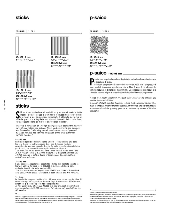 Depending on the destination of use, for Sticks we suggest a polymer modified cementitious grout or a coarse-
