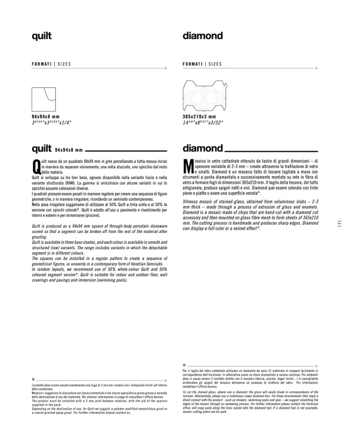 Quilt is produced as a 94x94 mm square of through-body porcelain stoneware
