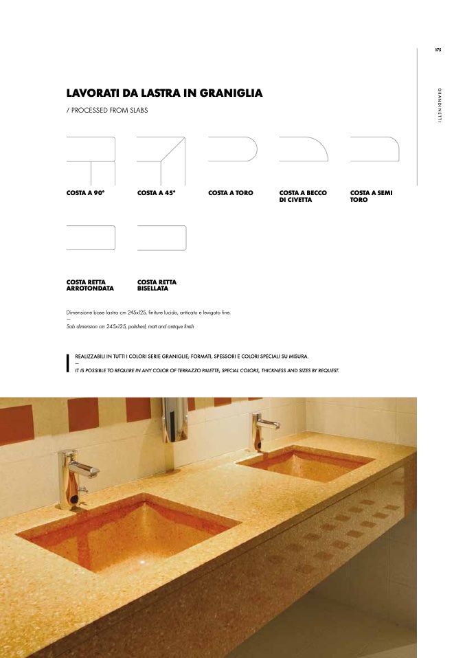 IT IS POSSIBLE TO REQUIRE IN ANY COLOR OF TERRAZZO PALETTE; SPECIAL COLORS, THICKNESS AND SIZES BY REQUEST.