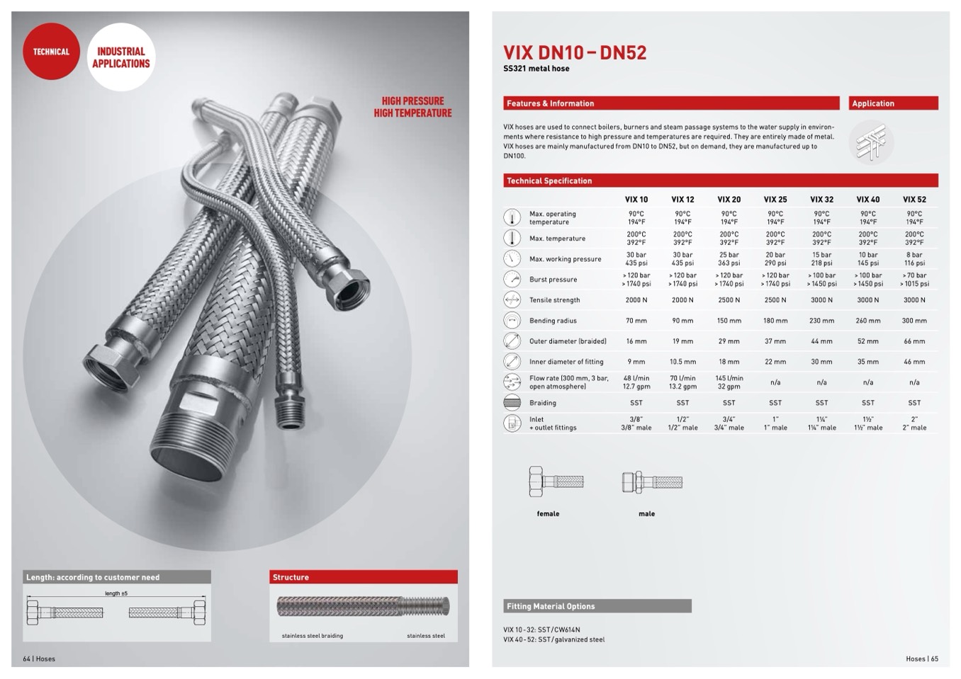 VIX hoses are mainly manufactured from DN10 to DN52, but on demand, they are manufactured up to