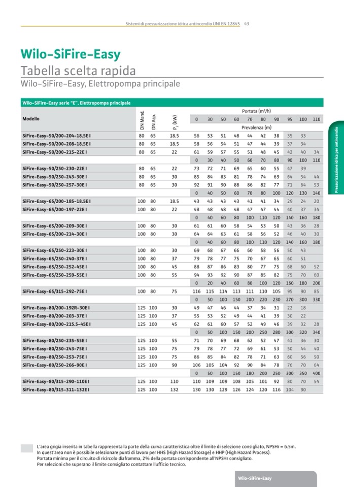L’area grigia inserita in tabella rappresenta la parte della curva caratteristica oltre il limite di selezione consigliato, NPSHr = 6.5m.