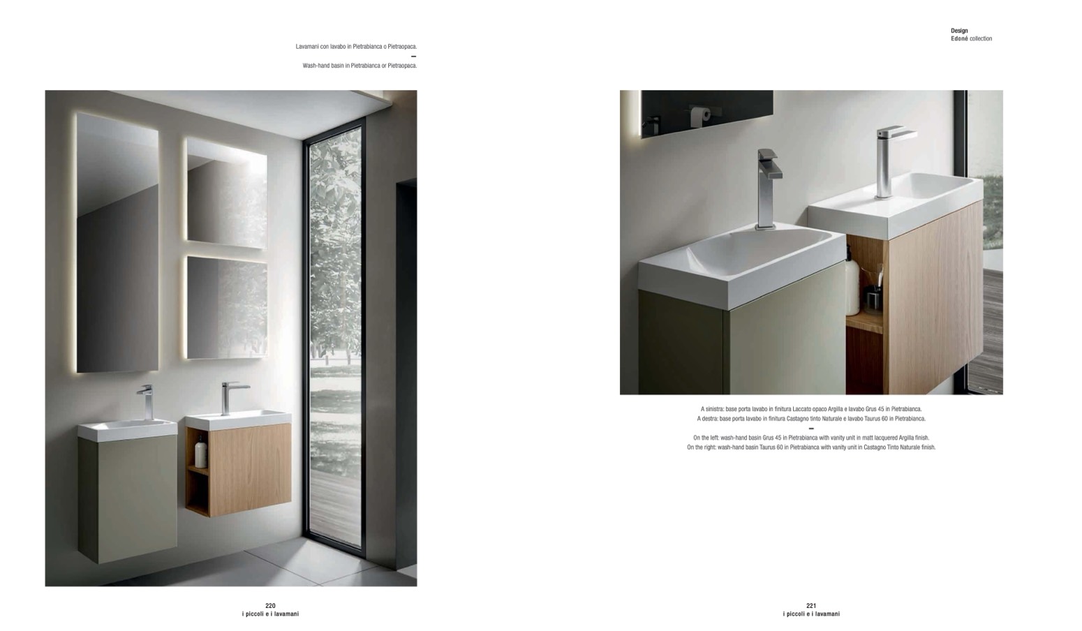 On the left: wash-hand basin Grus 45 in Pietrabianca with vanity unit in matt lacquered Argilla finish.