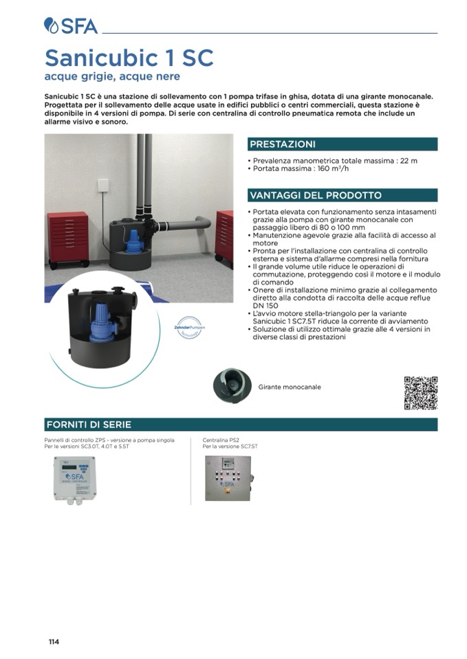 Sanicubic 1 SC è una stazione di sollevamento con 1 pompa trifase in ghisa, dotata di una girante monocanale.