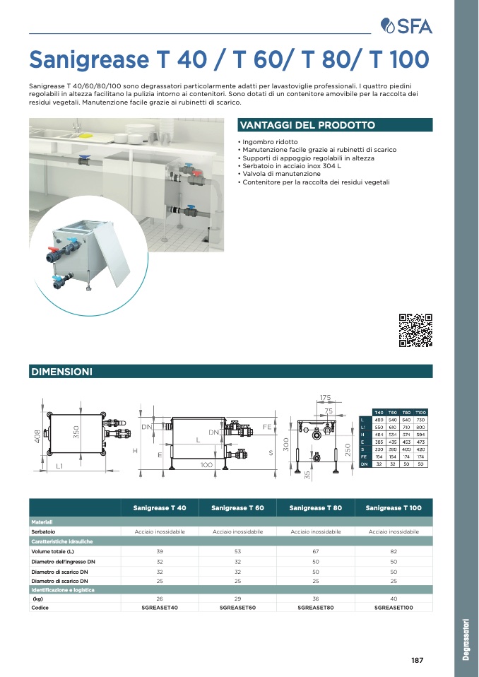 Sanigrease T 40/60/80/100 sono degrassatori particolarmente adatti per lavastoviglie professionali. I quattro piedini