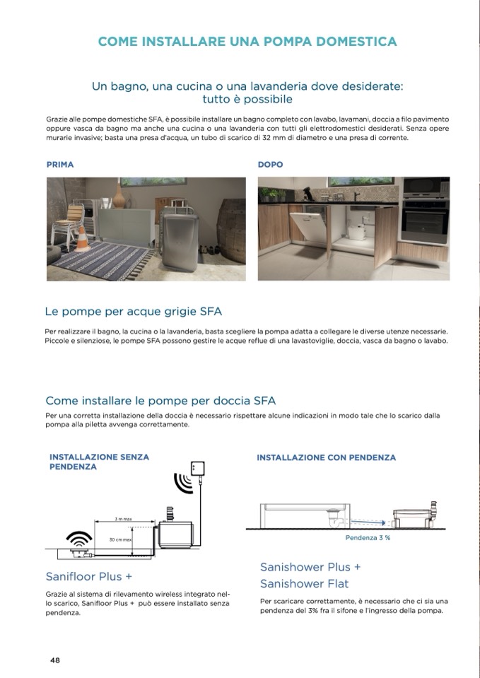Piccole e silenziose, le pompe SFA possono gestire le acque reflue di una lavastoviglie, doccia, vasca da bagno o lavabo.