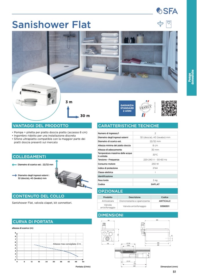 Sanishower Flat, valvola clapet, kit connettori.