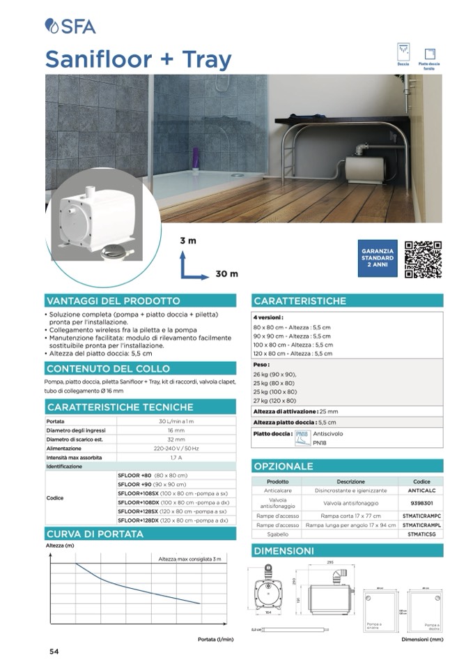 Pompa, piatto doccia, piletta Sanifloor + Tray, kit di raccordi, valvola clapet,