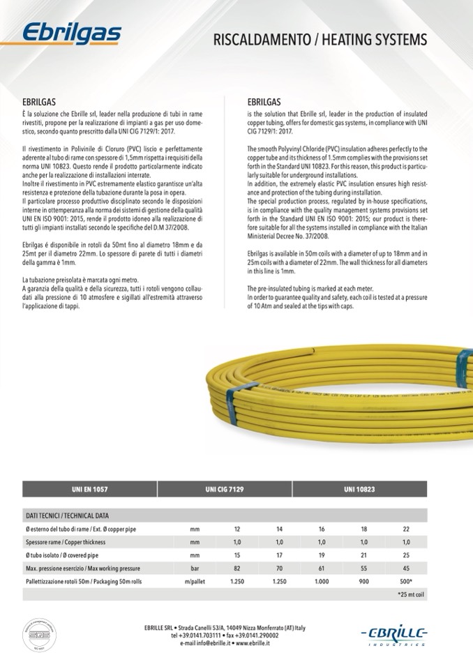 copper tubing, offers for domestic gas systems, in compliance with UNI