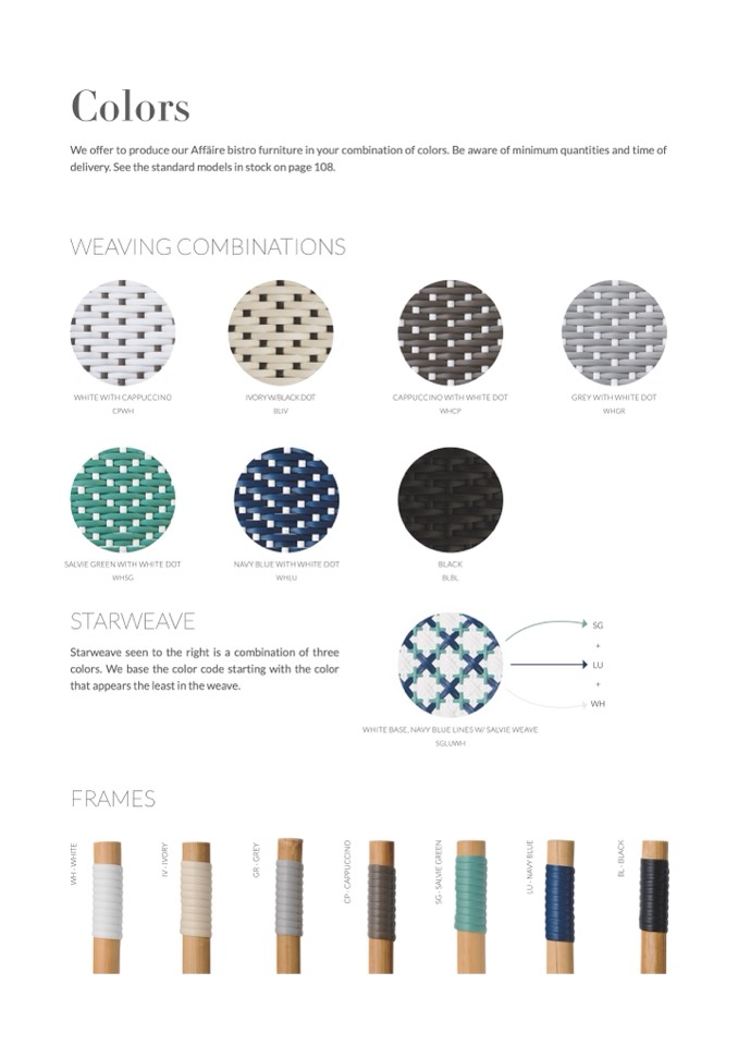 We offer to produce our Affäire bistro furniture in your combination of colors. Be aware of minimum quantities and time of