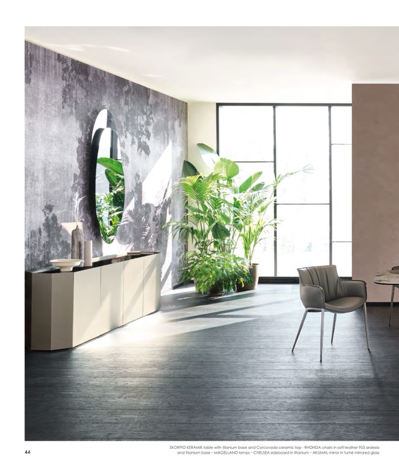 and titanium base – MAGELLANO lamps – CHELSEA sideboard in titanium – AKUMAL mirror in fumé mirrored glass