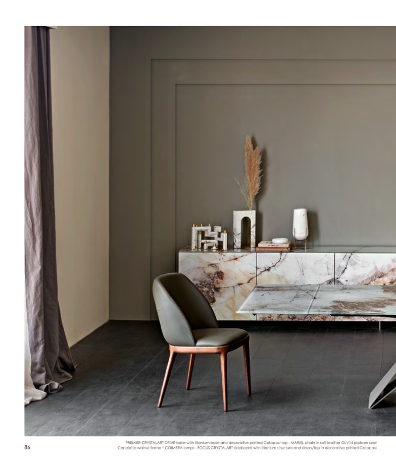PREMIER CRYSTALART DRIVE table with titanium base and decorative printed Cotopaxi top - MARIEL chairs in soft leather GLV14 platoon and
