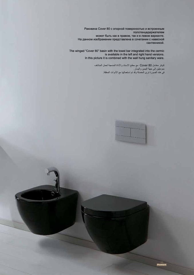 The winged “Cover 80” basin with the towel bar integrated into the cermic