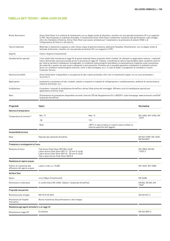 in PVC. Racchiudendo un substrato Armaflex, il rivestimento Arma-Chek Silver è altamente resistente alla perforazione e allo strappo,