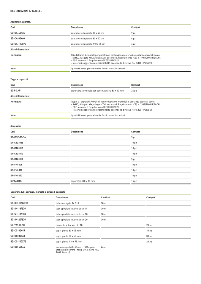 Gli adattatori Armacell per pareti non contengono materiali o sostanze elencati come: