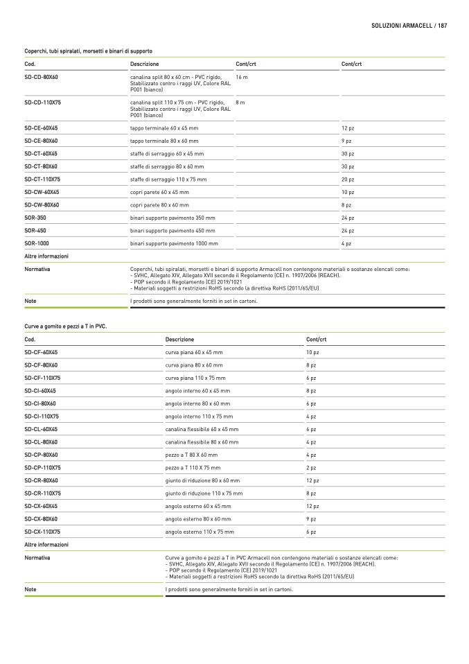 Coperchi, tubi spiralati, morsetti e binari di supporto Armacell non contengono materiali o sostanze elencati come: