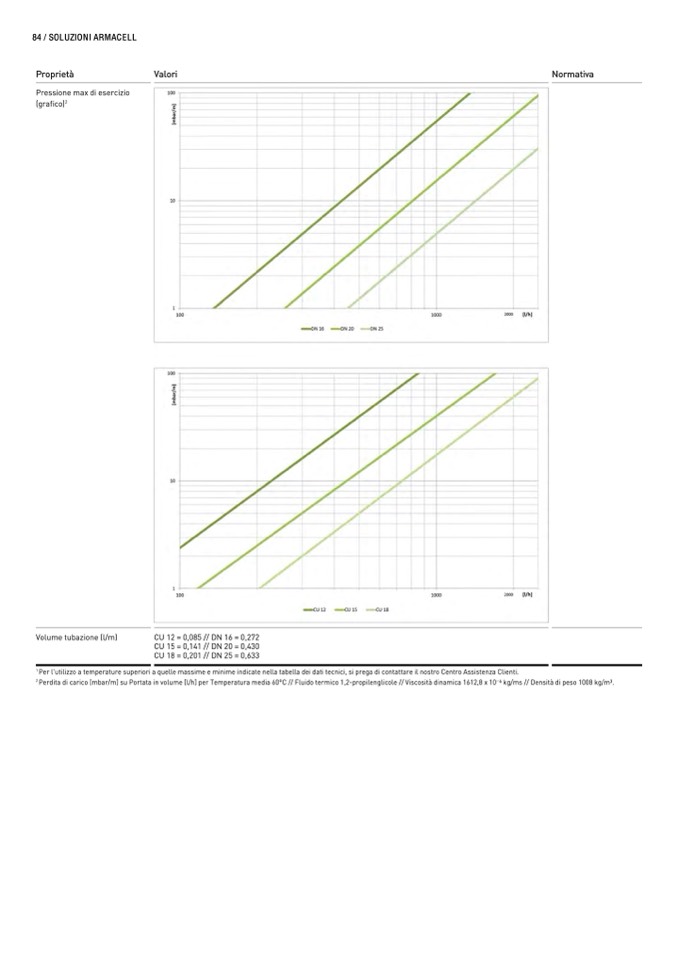 Perdita di carico [mbar/m] su Portata in volume [l/h] per Temperatura media 60°C // Fluido termico 1,2-propilenglicole // Viscosità dinamica 1612,8 x 10